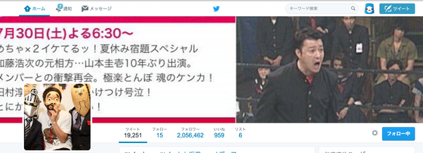 かねてから復活に対し、前向きに対応してきた人気お笑い芸人コンビ「ロンドンブーツ1号2号」の田村淳さんは、本日の出演にむけ、ツイッターアカウントの背景を本日の放送PR画像に切り替えるなどして祝福していた。実は昨年から徐々に復活の兆しが見えていた山本圭壱を影で支えつつ、じわじわ紹介していたのが田村さんだった。
