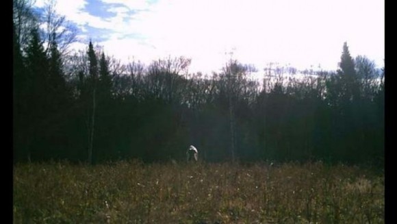 ここは、まわりを木で囲まれた開けた野のようだ。そのど真ん中、遠くのほうに、小さな人物が立っているのがわかる。これは人なのだろうか? 一見して、奇妙な白いオーラに包まれた男のようにも見える。中心の黒い部分は人のように見えるが、実際はいったいなんだろう? 鮮明な写真ではないので、これを撮ったカメラはかなり古いようだ。