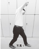 「写真(5)は、足を後ろに軽く1歩引いて同じ側の腕を上げ、体を反らしながら反対側に倒してください。長時間運転で収縮した腰や股関節の改善につながり、腰痛を軽減できます」