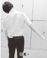 このストレッチは、長時間の座位による疲れにも効果的だという。写真(6)は、腕を120度ほど上げた状態(外転)で、そのまま後方に持っていき、さらにその際、もう片方の腕で鎖骨を押さえてストレッチするというもの。