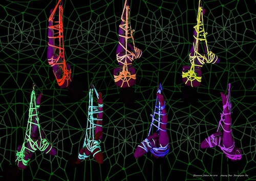 蛍光ロープを使った緊縛写真の数々も展示されている。女性の裸体に結びつけられた、ピンク、イエロー、オレンジのカラフルな線たちはどれも芸術的であり、思わずうっとりと見つめてしまう。女性のポーズや蛍光ロープの縛り方などにより、パターンは無限大に広がり、見る写真ごとに違った世界を感じられる。