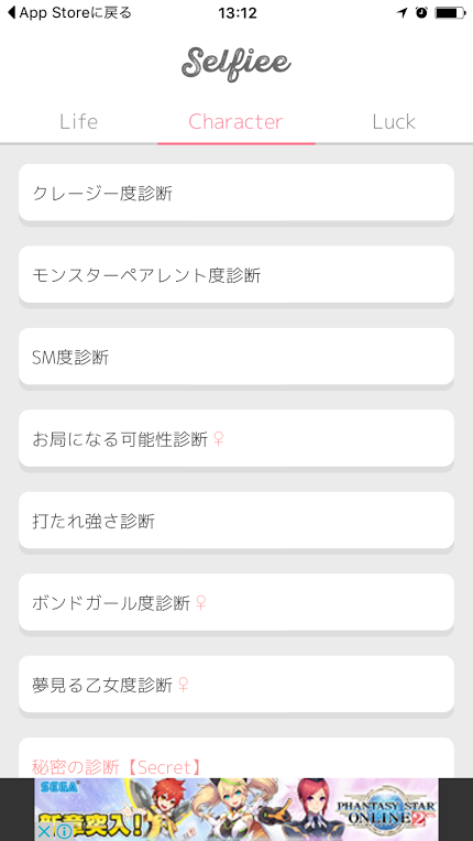 【Character】では性格に関する診断ができます。「クレージー度診断」や「SM度診断」、「お局になる可能性診断」などユニークな診断があり、自分の知らなかった内面が分かるかもしれません!