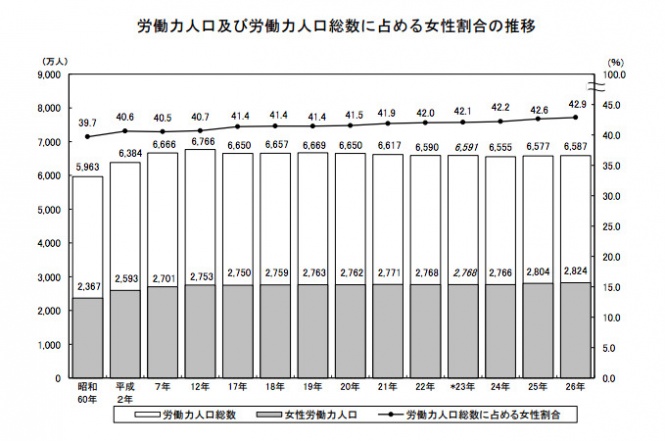 労働力人口総数を占める女性の割合は42.9%となっており、女性の社会進出は年々実現されているという結果が出ていました。