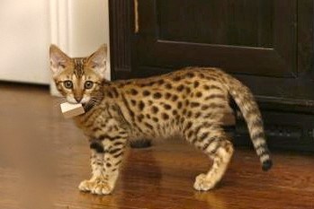 10 かわいらしいこの猫はアフリカのサーバルキャットと一般家庭で飼われていた猫とのミックスで、サバンナキャットという。