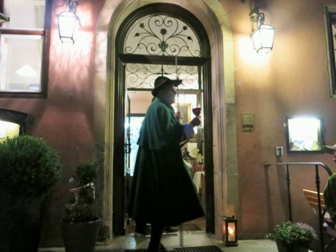 立ち寄るホテルやレストランでは、夜警の声を聞きつけたスタッフがワインやビールを持って来てくれ、参加者も含めみんなで回し飲み。