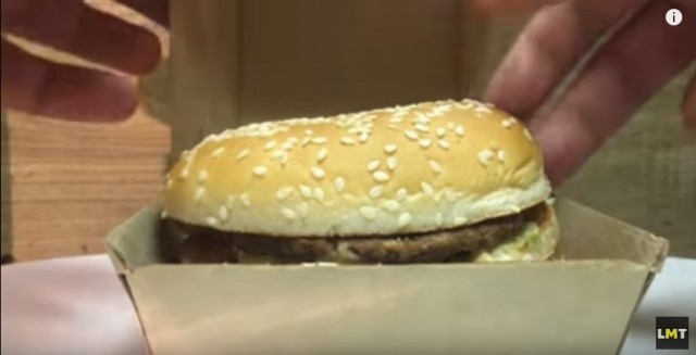 お馴染みのハンバーガー、ビッグマック。この世界的ファーストフードに硫酸をかけ、溶けていく様子を観察するという。それでは早速、硫酸がビッグバックをゆっくりと溶かしていく様子をご覧いただこう。