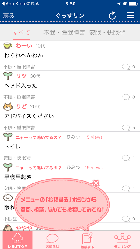 「ぐっすりひろば」では、睡眠に関する相談を自由に投稿でき、同じような悩みを持つ人達と情報交換ができます。
