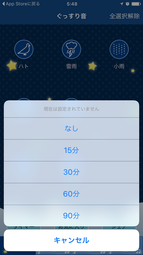 複数の音を組み合わせて再生することもできます。また、画面右上の「全選択解除」をタップすれば、まとめて再生の解除ができます。気に入った組み合わせは登録できる☆
