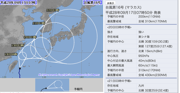 台風16号の中心気圧は930hpaで、中心付近の最大風速は50m/sの風が吹いている。日本列島に接近する際はもう少し勢力は衰えるものの、この時期の台風はほぼ勢力を維持したまま上陸することが多い。そのため進路となっている九州地方では大きな打撃を受ける可能性が高い。
