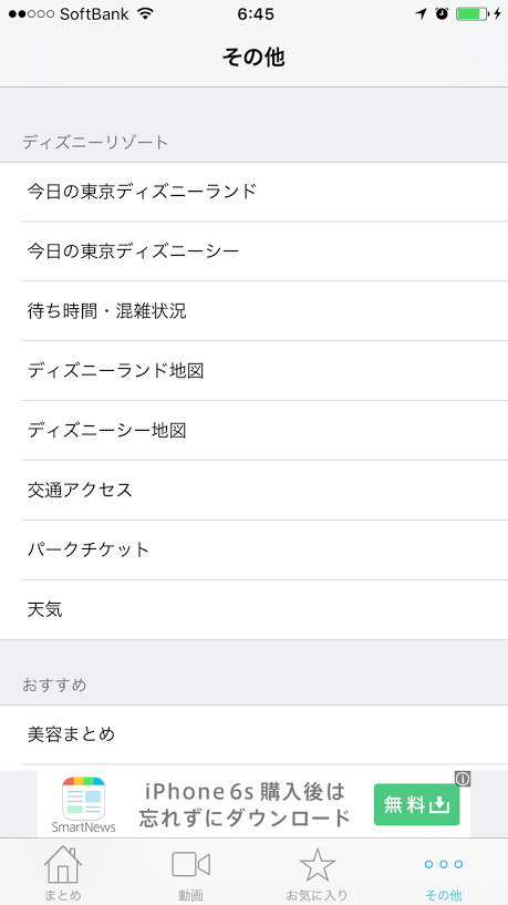 「その他」画面では、ディズニーリゾートの公式ページへのリンクや、待ち時間、地図、天気など、パークで遊ぶ時に便利な情報をチェックすることができます。