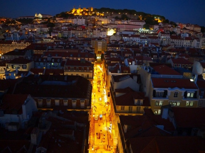 リスボンの街を見下ろす高台に建つサン・ジョルジェ城からバイシャ地区へと続く道路は、オレンジがかった光の道に変身。