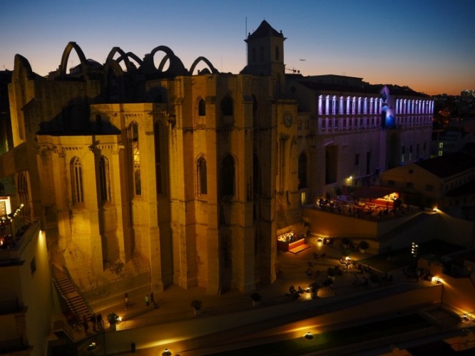 1755年のリスボン大地震の被害を今に伝えるカルモ教会。ライトアップされた夜は幻想的な姿で私たちの目を楽しませてくれます。