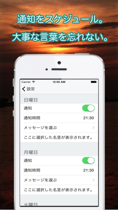 【設定画面】では、お気に入りの名言の通知設定もできます。