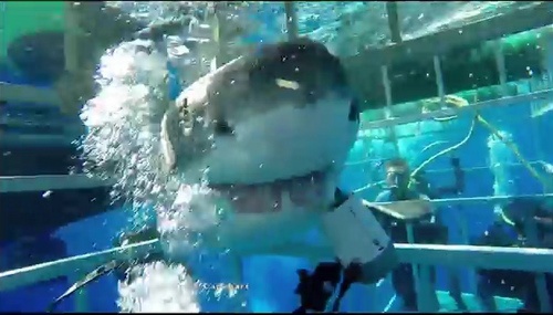 しかしその檻にはカメラの覗き口があり、その隙間からホオジロザメが突っ込んできたのだ。サメは人の臭いに敏感で一目散に食べようと必死に檻の中に入ってこようとしている。檻を突っ切って体がほとんど入ってしまったが、ヒレが邪魔したのかサメはそのまま引き返してカメラマンは難を逃れた。