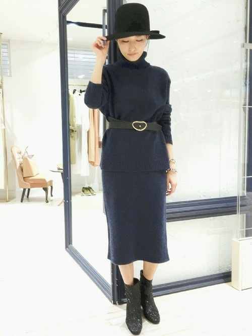 上下同色のニットアップは縦長ラインを強調してくれるので、細見え効果も期待できます。