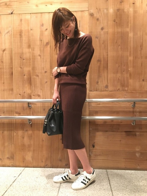 ひざ下タイトスカートのニットアップは、今季らしさ抜群のアイテム。
