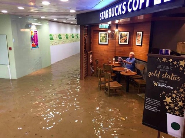 浸水した地下街でドンと構えて新聞を読む、なんとも剛毅なオジさんが海外で話題になっている。