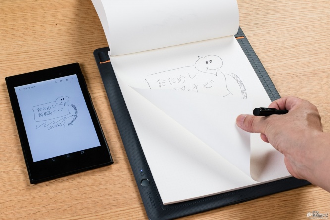 専用ノートは厚手の光沢を抑えた画用紙の質感。図などを書きやすいよう5ミリ単位で点が打ってある。専用ペンの引っ掛かりが良くて文字は書きやすい。電磁誘導方式で感知し、デジタルインク標準化技術「WILL」を採用してプラットフォームを問わない描画が可能になっている。
