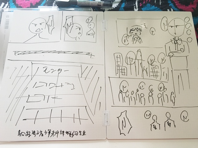 こんな風に中央がマグネットで繋がっていて、強めに引っ張ると簡単に分離します。見開きだと随分と大きく使えるので、漫画のネームはもちろんサイトのフレームワークをメモったり、俯瞰したスケッチを取るには充分なサイズ感です。
