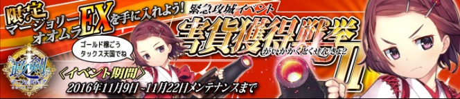 ゲームの企画・開発・運営事業を展開するDMM GAMES【代表:片岸 憲一(かたぎし けんいち)】(本社:東京都渋谷区、http://www.dmm.com/netgame/)とオンラインゲームの運営・配信を行う株式会社テクノード(本社:東京都目黒区、代表取締役:鎌田寛昭、http://tekunodo.jp )は、提供する、総理になって「戦挙」で「ヤトー」を倒すシミュレーションゲーム「政剣マニフェスティア」において、11月9日のメンテナンスから11月22日メンテナンスまでの期間限定でイベント限定政霊「マージョリー・オオムラEX」が手に入るタイムアタック型の緊急攻城イベント「害貨獲得戦挙II」を開催します。