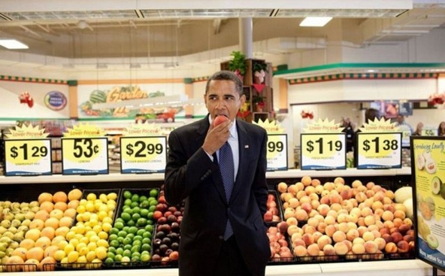 2009年、ヴァージニア州のスーパーマーケットにて桃をかじる大統領。