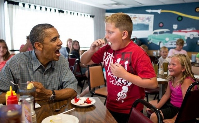 2012年7月5日、オハイオ州のこじんまりしたレストランに立ち寄ったオバマ大統領は、デザートのストロベリーケーキを子供とシェア。この子にとって一生の思い出になるはずだ。