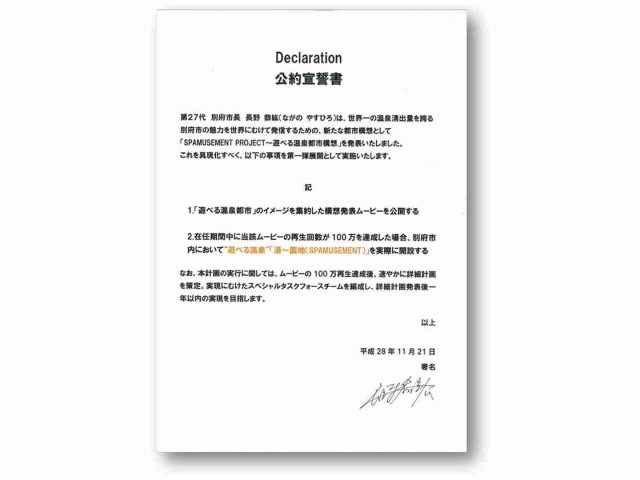 別府市の公式ウェブサイトには、別府市長である長野恭紘(やすひろ)氏の署名による公約宣誓書まで公開されているのだから、恐らく別府市は本気に違いない。