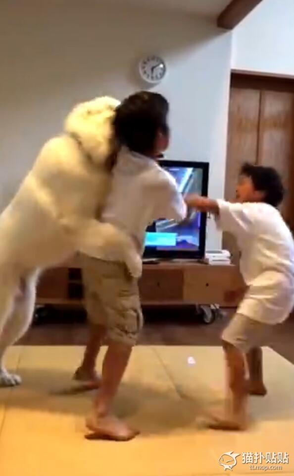 こちらのワンちゃんは、兄弟喧嘩の中に入って無邪気にじゃれ合っている・・・わけではなく、なんとこの兄弟喧嘩を仲裁しようとしているようだ。「ダメだよ!喧嘩はやめなよ」実は人間も動物も喧嘩をしているというのは良くないことだと理解しているに違いない。ということで、あろうことか飼い犬に仲裁されるということに・・・