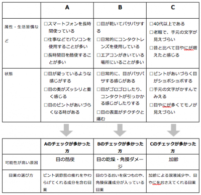 目の疲れ・かすみを自覚している人は、原因をこのチェックシートで確認し、それぞれに合った目薬を選んでみてほしい。