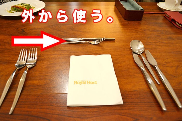 フォーク・ナイフの順番で、フォークは上向き、ナイフは左向きに!