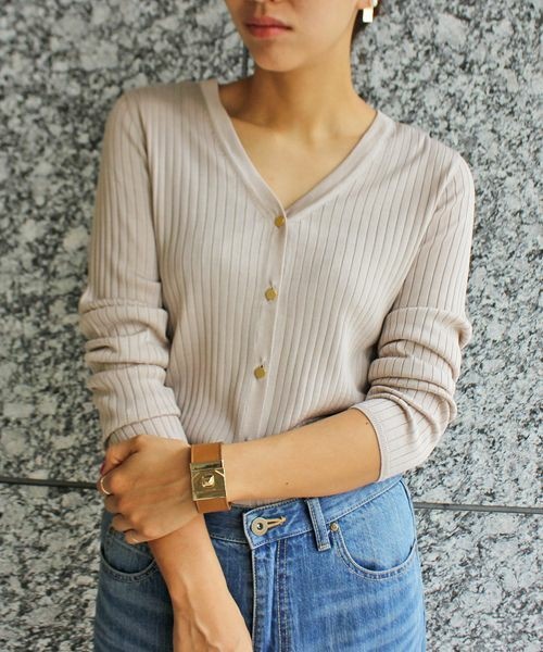 存在感のあるレザーバングルはエレガントなゴールド金具とのコンビを。