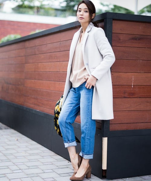 定番色ライトグレーのコートは、合わせやすさ抜群。シャープなファッションが好きなクール派におすすめ。