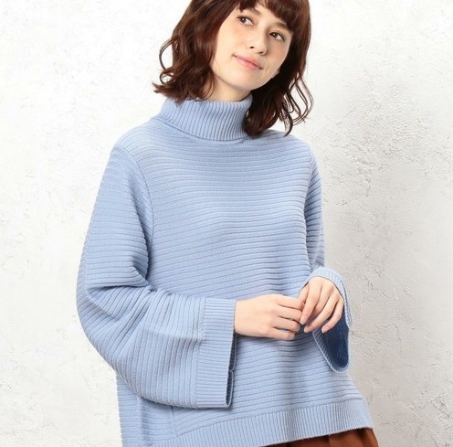 サックスブルーはいろんなアイテムがありますが、ゆったりサイズのニットは着やすいのでおすすめ。中でも、合わせやすくて大人に似合うシャープなVネックが一押しです。