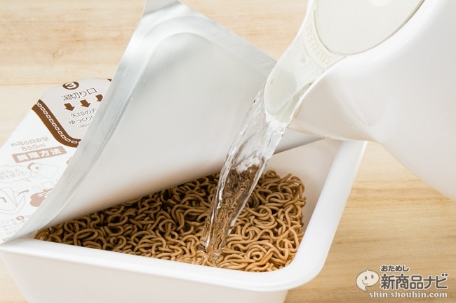 リニューアルの目玉は、昨年は通常の「一平ちゃん」の麺を使用していたが、今回はご丁寧に麺にココアパウダーを練り込んだという念の入れよう。お湯を注ぐと、ココアの香りが焼そばの麺から漂ってくるという非常にシュールな空間ができあがる。