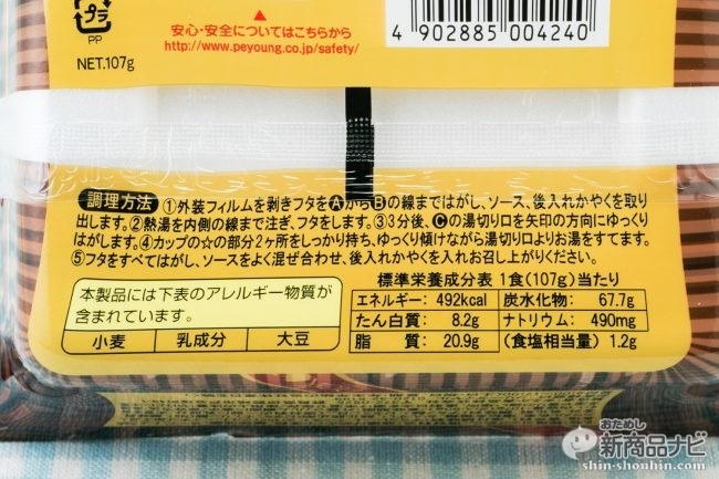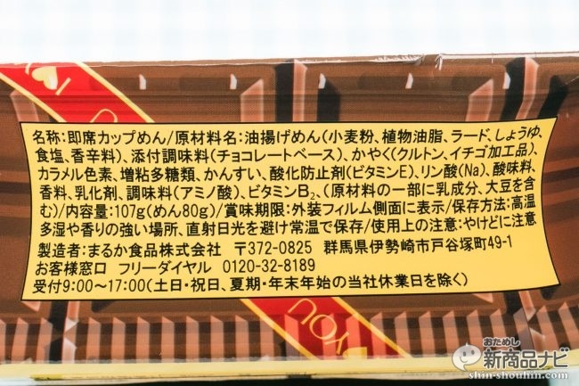 原材料で味の手がかりとなるのは、添付調味料(チョコレートソース)と、かやく(クルトン、イチゴ加工品)のみ。ちなみに1食(107g)あたり492kcal。通常の「ソースやきそば」は120gで518kcalなので、カロリーはほぼ同程度といえる。