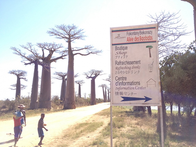 有名なバオバブ並木の入口には看板があり、日本語も表示されています。