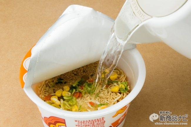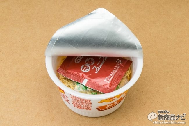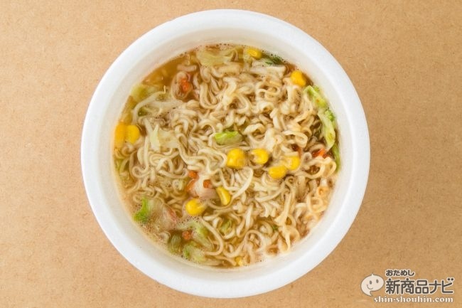 湯入れは3分。仕上がって蓋を再度めくると、主張しすぎない味噌の香りが立ち上がる。濃厚味噌好きだったらがっかりしそうなライトな味噌フレーバー。でも記者はこうした、ほのかな味噌風味のカップ麺が好きなので、より期待が高まる。