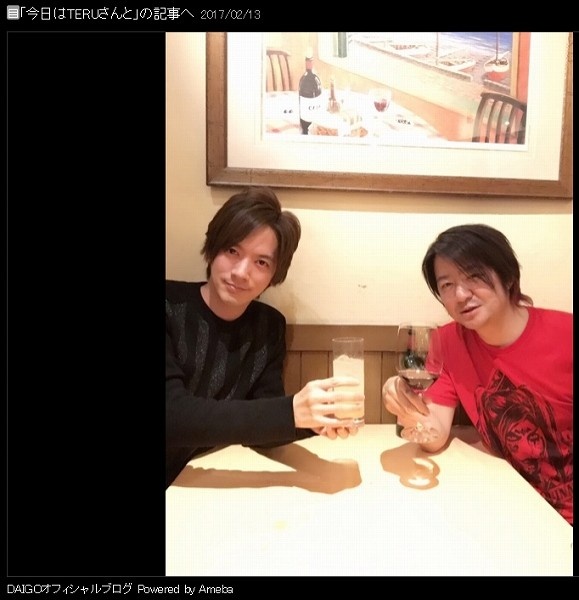 「今日はTERUさんと」と題したブログには、DAIGOがボーカルを務めるロックバンド・BREAKERZが2017年のデビュー10周年を記念して開催している対バンドイベントライブ『BREAKERZ 10周年10番勝負 -VS-』に最終組として出演することが発表されている先輩バンド・GLAYのTERUと食事をしながらイベントの打ち合わせをしたことを、「なんと TERUさんと 御飯にいきました 初の 2人で やばいよね これは」と興奮冷めやらぬ様子で綴った。
