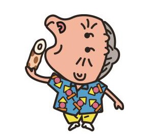 カラムーチョのパッケージでおなじみの「ヒーおばあちゃん」は、ちくわのパッケージにも登場しています。カラムーチョのときとはちょっと違うシャツの柄に注目です。通常は丸・三角・四角の幾何学模様ですが、ちくわのパッケージではこれらが合体しておでん柄になっていたり、手にしているのがちくわに変わっていたりとなかなか手が込んでいます。