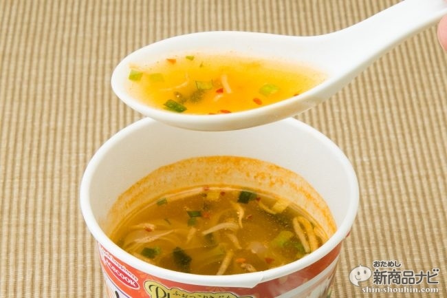 麺を一口いただくと、カップラーメンを食べ慣れていた記者にとっては想像していたより味が薄く感じた。また、麺はモチモチではなくチュルチュル。歯であっさり噛み切れてしまう。