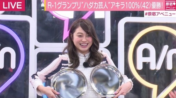 エンタメニュースのコーナーでは、「R-1ぐらんぷり2017」で優勝したお笑い芸人・アキラ100%の話題に。スタジオでも藤本・大川がお盆を使った芸に挑戦し、大川は「(隠すのは)こっち(上)ですかこっち(下)ですか?」と言いながら2つ用意されたお盆を使って果敢チャレンジしていた。
