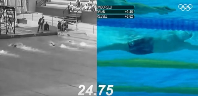 クッキリとしたハイビジョンと白黒映像の対比という、水泳以前の歴史を感じてしまう部分もあるが、それは置いておいて肝心のタイム差に注目したい。