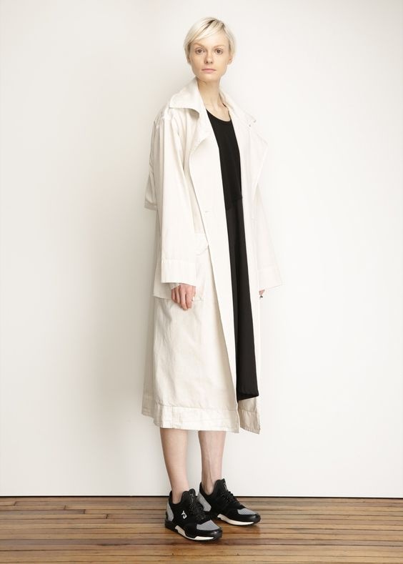 膝丈のシンプルなロングワンピースと変形のトレンチコートでつくる、簡素なモードスタイル。