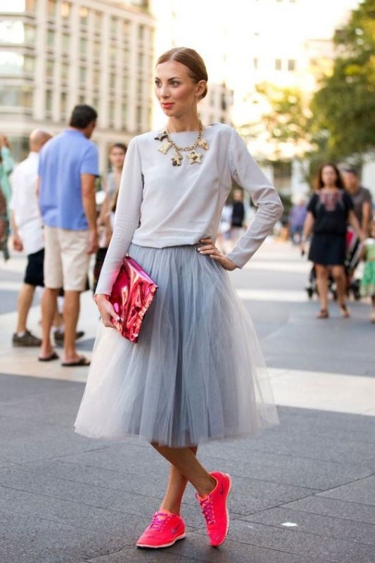 女性らしさたっぷりのチュールスカートに、あえて蛍光ピンクのランニングスニーカーをミックス。