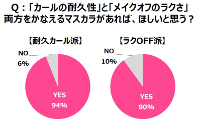 そこで、「カールの耐久性」と「メイクオフのラクさ」両方をかなえるマスカラがあれば、ほしいと思うかを聞いたところ、「耐久カール派」の94%、「ラクOFF派」の90%がそれぞれ「ほしいと思う」と回答した。『ヒロインメイク 第3のマスカラどっち派』特設サイト公開中!