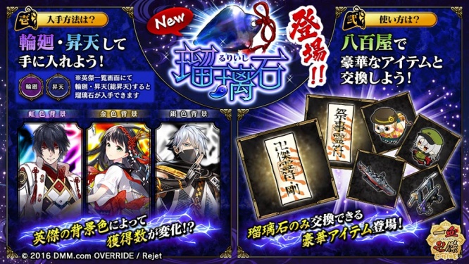 3/16(木)メンテナンス後より、英傑を輪廻・昇天(総昇天)をすることで「瑠璃石」が手に入るようになりました!