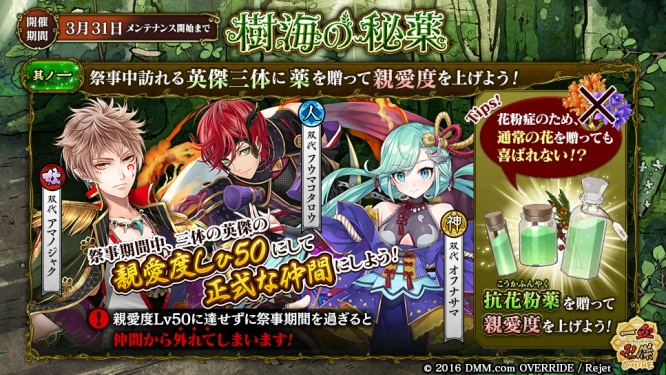 ゲームの企画・開発・運営事業を展開するDMM GAMES(http://www.dmm.com/netgame/)は、DMM上のオンラインゲームサービスとして展開している【一血卍傑-ONLINE-】にて、3月16日(木)メンテナンス後より、新しい祭事「樹海の秘薬」の開催を含むアップデートを実施しますことをお知らせいたします。アップデート内容の詳細は以下をご参照ください。