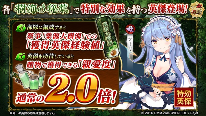 新祭事「樹海の秘薬」限定の特効英傑「サトリ」を部隊に編成して討伐を行うと、「薬源大樹海」で獲得できる「英傑経験値」が増量します。