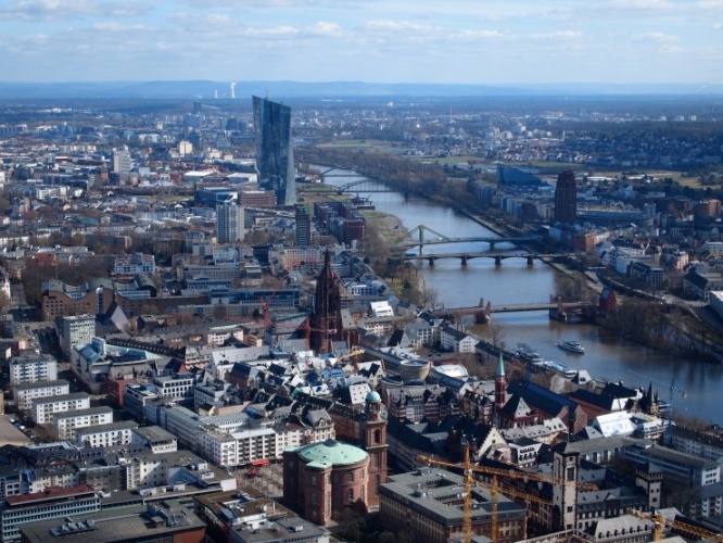 旧市街の方向へ目を向ければ、レーマー広場や大聖堂、そしてその背後には新しく完成した欧州中央銀行のビルも見えます。町に沿って流れるマイン川もまた美しいですね。