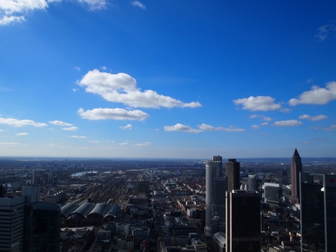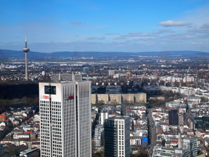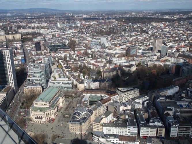 上からフランクフルトを眺めると、高層ビルが植物の様にニョキニョキと生えているみたいですね。ガラス張りのツインタワーはドイツ銀行、赤い「S」のマークがあるのはシュパールカッセという銀行のビルです。